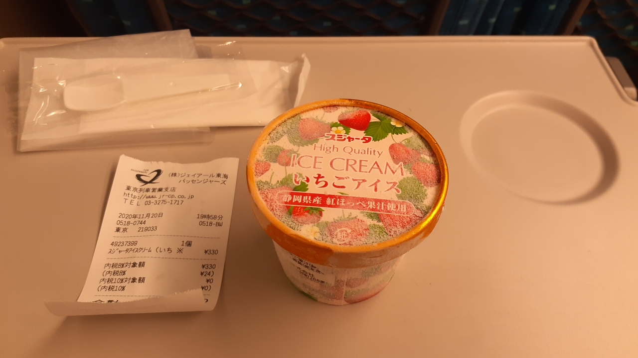 2020年11月20日に浜松19時11分発ひかり518号東京行きを利用したのですが、この日の車内販売ではバニラ・マロングラッセ・いちご等のアイスクリームの取扱いがありました。