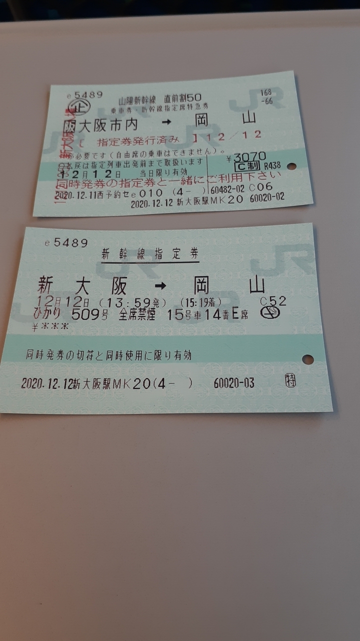 とはいえ2020年12月12日に新大阪から岡山までこの切符を利用してひかり号で移動したのですが、自由席料金でも5,500円程度かかるところが半額近い3,070円で利用できたのは嬉しい限りです。