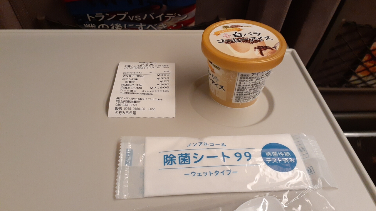 2020年10月17日に利用した際、車内販売では「せとうち広島フェア」と称して広島にちなんだ商品が販売されている旨紹介しましたが、日を改めて2020年10月30日に利用したところ、車内販売で「白バラコーヒーアイス」のアイスクリームが販売されていました。