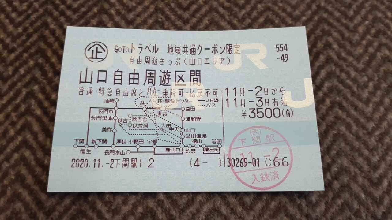 支払いの際、少なくともGo toトラベルの地域共通クーポン(紙のみ対応、電子クーポンは不可)を1枚使用することが条件で、山口エリアの場合、3,500円で山口県内のほとんどのエリアと島根県の一部(益田以西の山陰本線・津和野エリア等益田以南の山口線)のJRの特急(基本的にはスーパーおき号)・快速・普通の各列車の自由席、山口県内の一部エリアの中国JRバスと防長交通の路線バス、さらに新山口駅と萩を結ぶ「スーパーはぎ」と称する特急バスが連続した2日間利用し放題(乗り放題)になる為、利用価値は高いと思います。