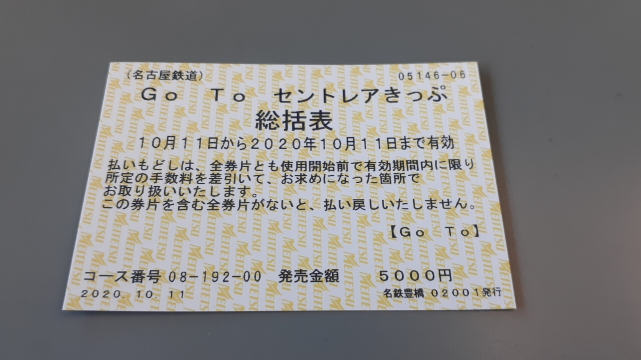 この切符、①名鉄電車の1日フリーきっぷ、②「フライトオブドリームズ」というテーマパークの有料エリアの入場券の引換券、③中部国際空港又は先程紹介した「フライトオブドリームズ」の中にある11店舗の飲食店のランチに利用できる飲食チケット④ミュースカイ又は快速特急・特急の特別車両券の割引券、⑤1,000円分の地域共通クーポンがセットになった切符で、本来の値段は5,000円しますが、Go toトラベルの取扱商品になるらしく、35%引きの3,250円で購入することが出来ました。