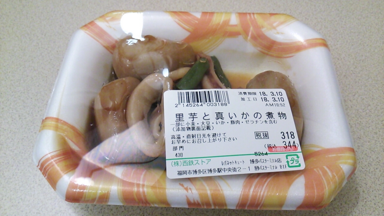 弁当・惣菜の品揃えもそれなりにあり、2018年3月10日に「里芋と真いかの煮物」を購入しました。