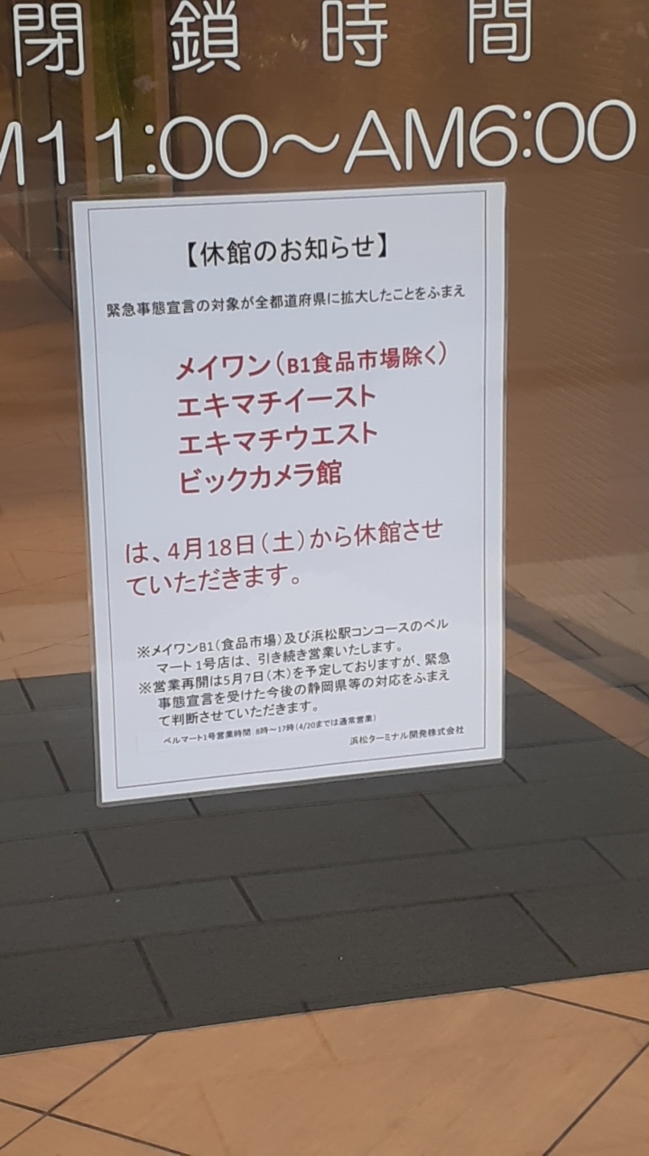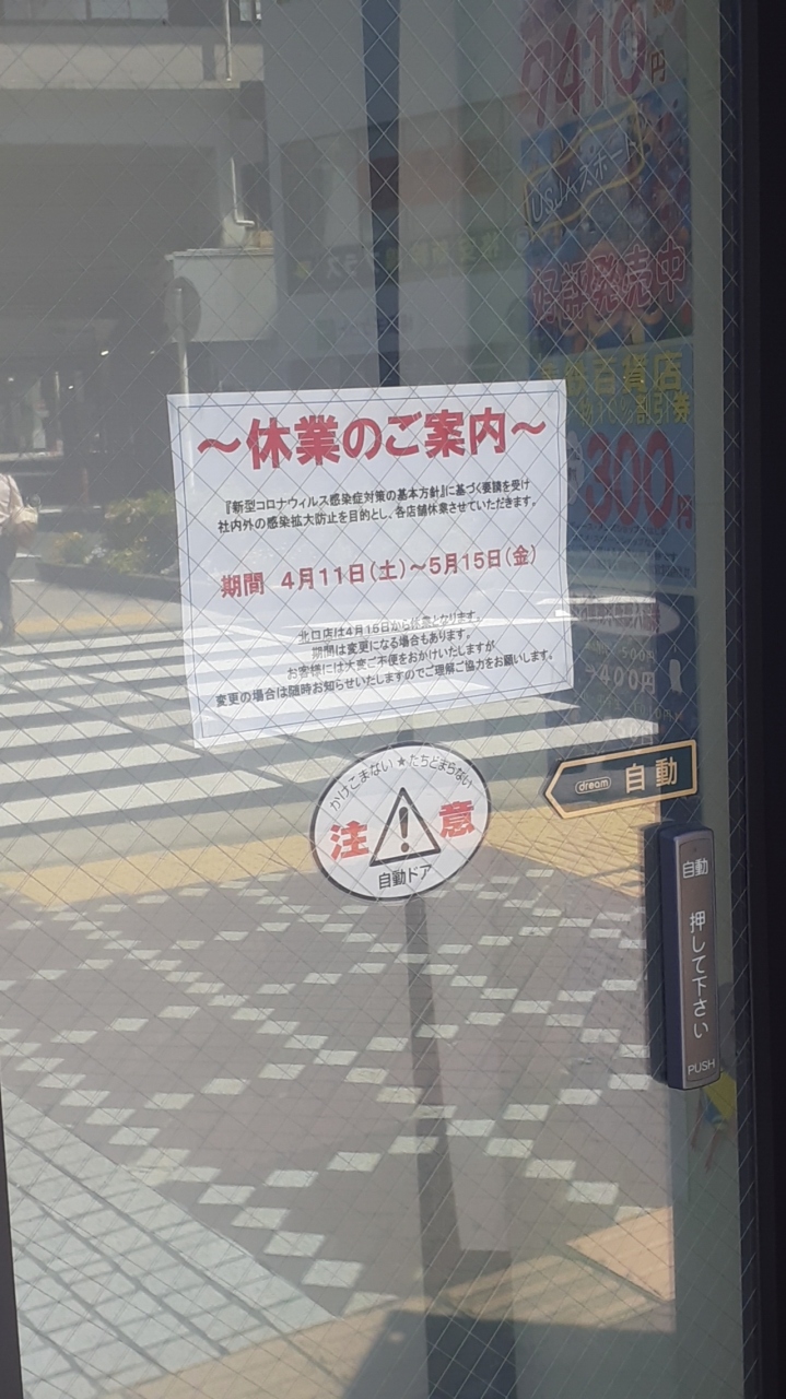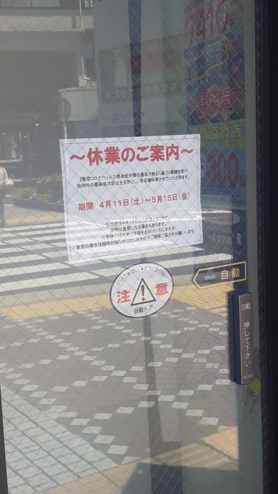 コロナウィルス感染拡大予防の為、営業時間の短縮を行っていましたが、2020年4月16日付けで非常事態宣言の対象区域が全国に拡大したことに伴ってか2020年4月17日現在、2020年4月18日から2020年5月6日までの間、一部を除き営業を取り止める旨掲示がありました。