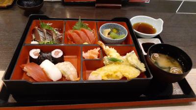 中身ですが、天ぷら・かつおのたたき・刺身(赤身)・煮物の他、寿司(鮪・いか・鉄火巻等)・味噌汁等が付いてきました。