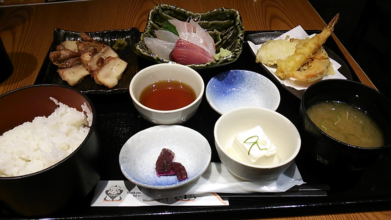 ご飯・味噌汁の他、刺身(鯛等3種類)・天ぷら(海老・なす等5品)・大山どり焼きが付いていました。
