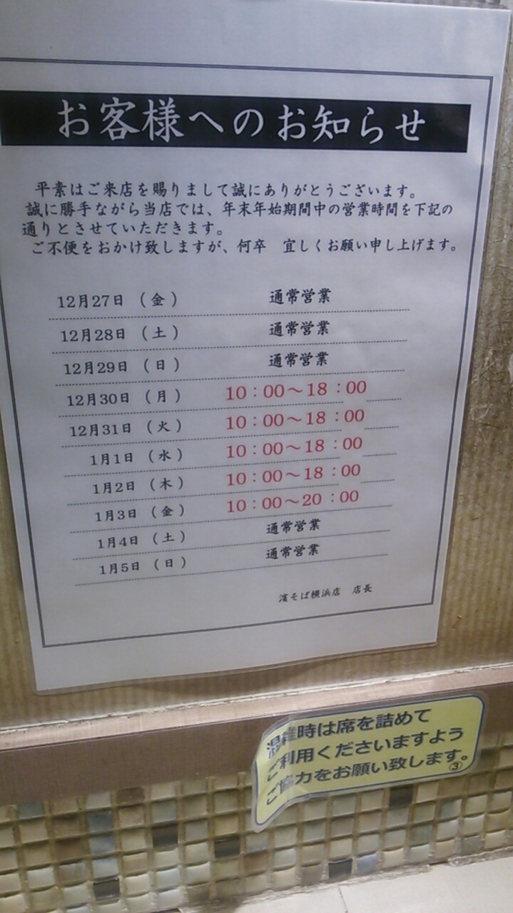 2019年12月22日現在、店内には年末年始の営業についての掲示があり、それによると2019年12月29日までと、2020年1月4日からは通常通りの営業をするそうですが、2019年12月30日から2020年1月2日までは営業こそ行うものの、午前10時から午後6時までの、2020年1月3日は午前10時から午後8時までの短縮営業になるそうです。