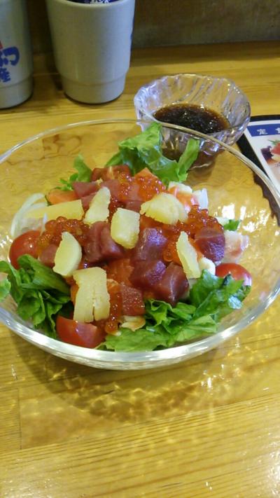 サーモン・鮪・数の子・帆立等が切り刻まれ、それらがレタス・トマト等と一緒に盛られていました。