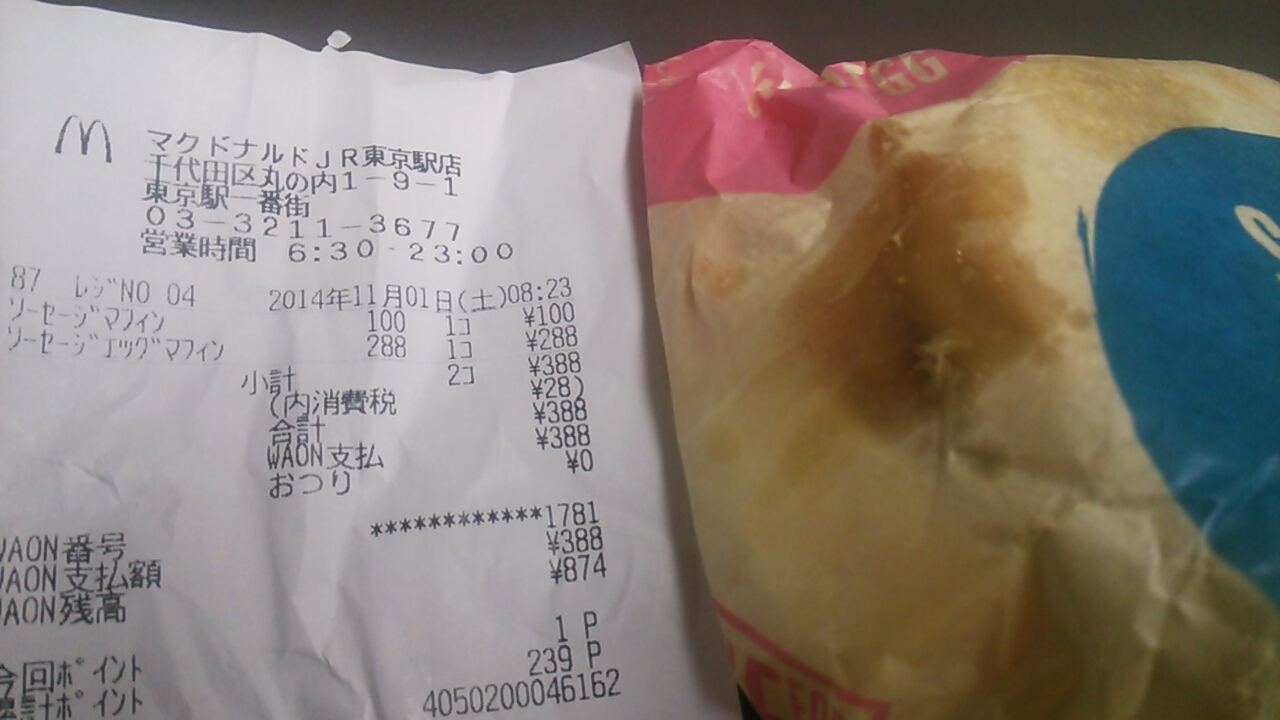 東京駅八重洲南口の端にあり、当日は朝食用にソーセージマフィンとソーセージエッグマフィンの単品を1つずつ買いました。僕の場合、マクドナルドは朝マックを利用する為に寄る事が多く、ソーセージの食感とほんのりとした塩味のハーモニーに病みつきになり、大抵はソーセージマフィンとソーセージエッグマフィンを注文します。