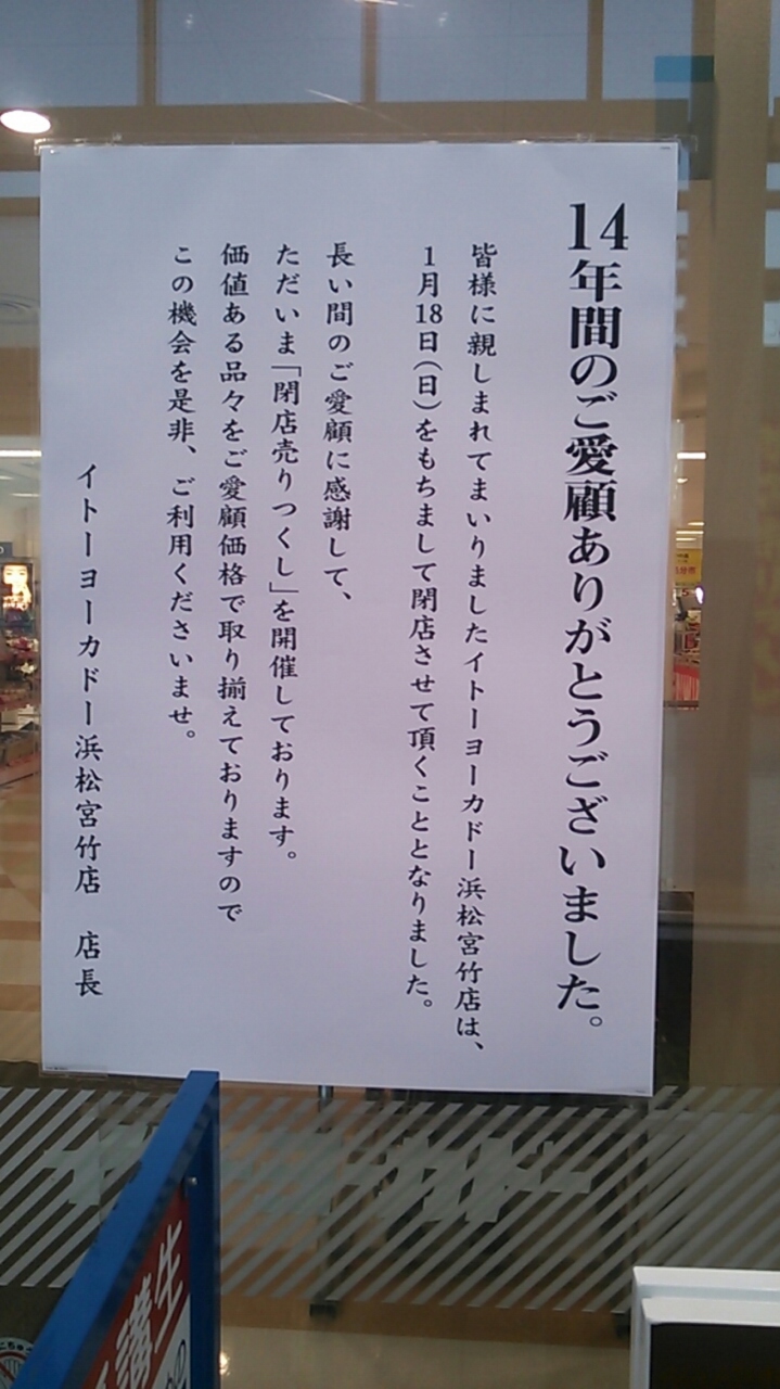 なおこのイトーヨーカドー浜松宮竹店、2015年1月18日の日曜日付けで閉店する事が決定していて、店内には至るところに「閉店売りつくし」の貼り紙がされ、1階入口近くにある特設コーナーでは衣料品が30%オフ、その他のお店も軒並み半額や○%オフの表示をしていました。- 旅行時期
