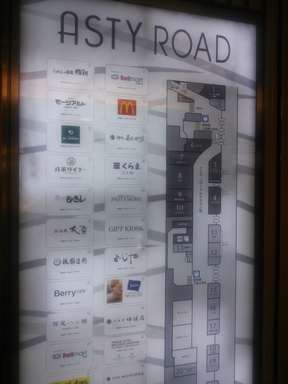 新幹線の高架下のうち1階部分に位置する「アスティロード」と2階部分のうち新幹線改札口の西側部分に位置する「アスティスクエア」から成り立ち、「アスティロード」では飲食店を中心に、お土産品のお店、ファッションのお店、ドラッグストア等が、「アスティスクエア」ではカフェ、お弁当、スイーツのお店等が入っていました。- 旅行時期