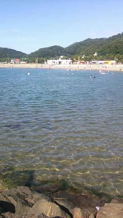 青い森鉄道の浅虫温泉駅からゆうやけ橋という歩道橋を利用して国道を渡り、右前方に位置する海水浴場(徒歩5分程度)で、2014年7月の東北・函館旅行の午後立ち寄りました。