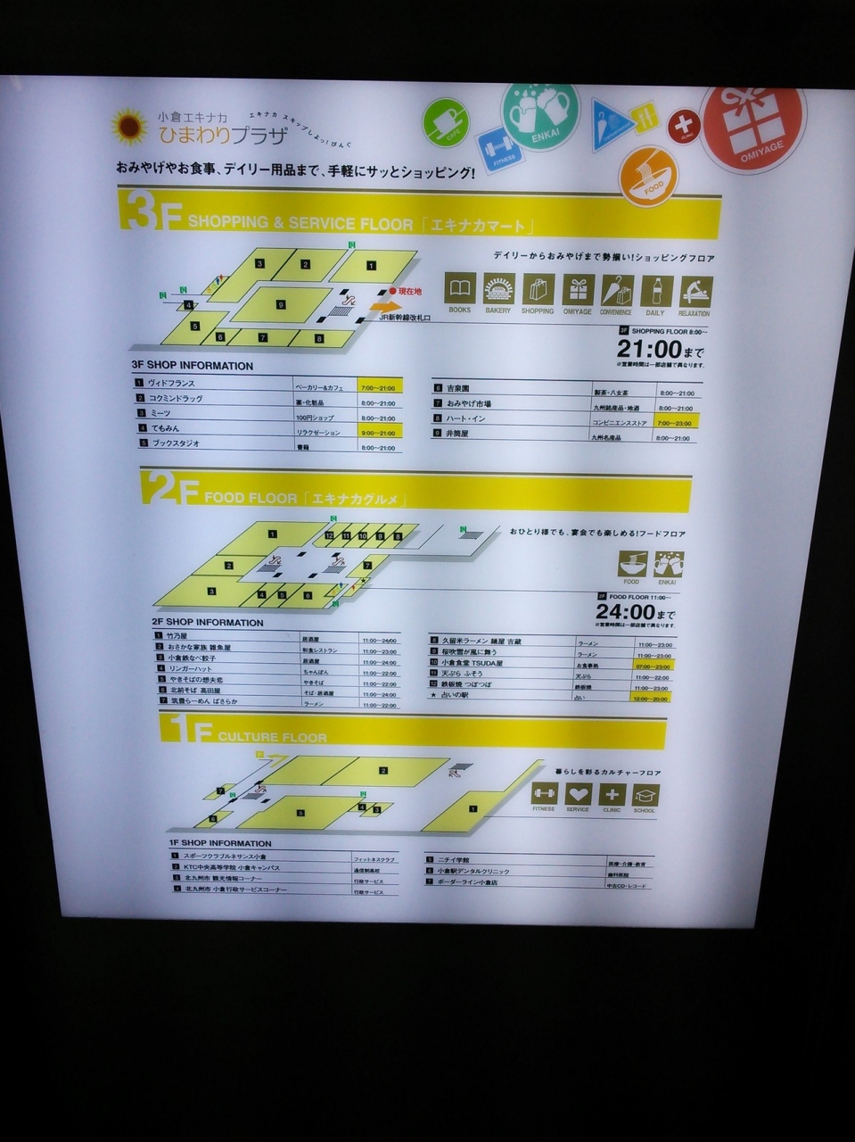 館内は地上3階建ての構造になっていて、1階はフィットネスクラブや北九州市の施設等が、2階は飲食店街が、3階はお土産の他、パン屋、100円ショップ等様々なショップが入っていました。
