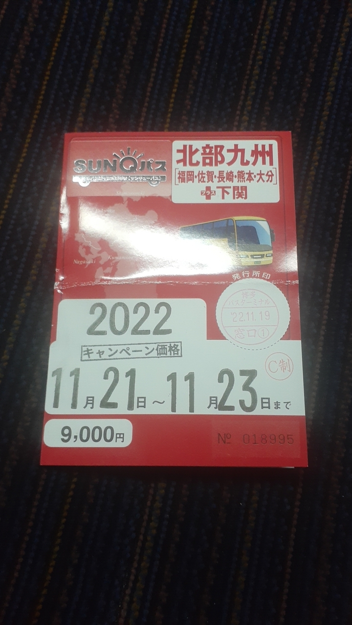 2022年11月20日に北部九州版の3日間用の切符を7,000円で購入し、2022年11月21日から2022年11月23日にかけて福岡市内を起点に長門市・杖立温泉・熊本市内の各地を高速バスで旅しましたが、それぞれの高速バス代の合計だけで19,000円程度しましたので、かなりお得に利用することが出来ました。
