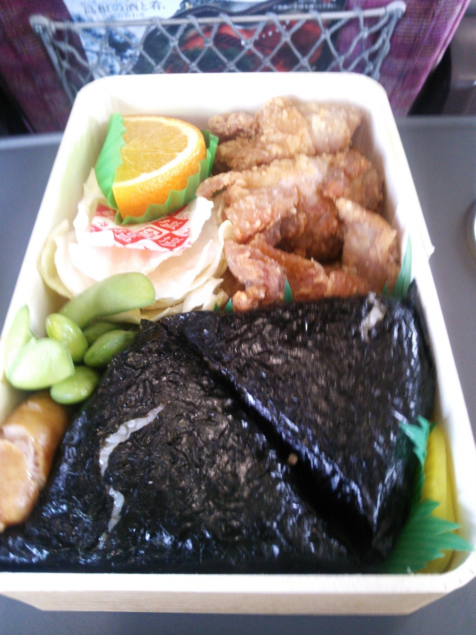 ちなみに僕のイチオシは「若鶏むすび」820円です。海苔で巻かれた三角おむすび2個の他、鶏の唐揚げ 3個、ウインナー、枝豆、キャベツ、果物等が入っているんですが、おむすび唐揚げが冷めても美味しいんです。特におむすびは御飯に適度な塩味があり、お米自体ふっくらとした食感がし、食べていて幸せな気持ちになります。個人的には店で食べれる出来立てより売店で買う持ち帰り用のほうが美味しいと思います。