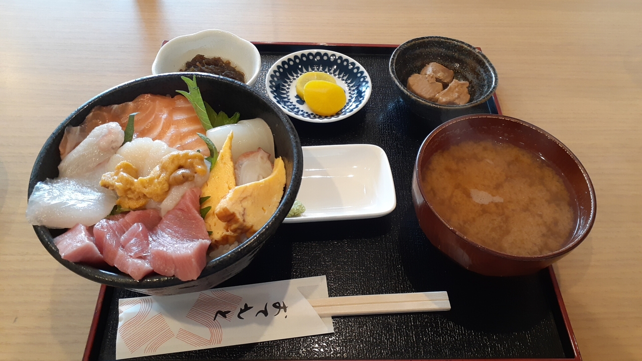 そのうちおまかせ海鮮丼ですが、こちらのお店での人気No.1のメニューらしく、この日の場合、鮪・うに・帆立・たこ・サーモン等多彩な具が乗り、さらに小鉢・味噌汁等も付いていて、良心的な内容に感じました。