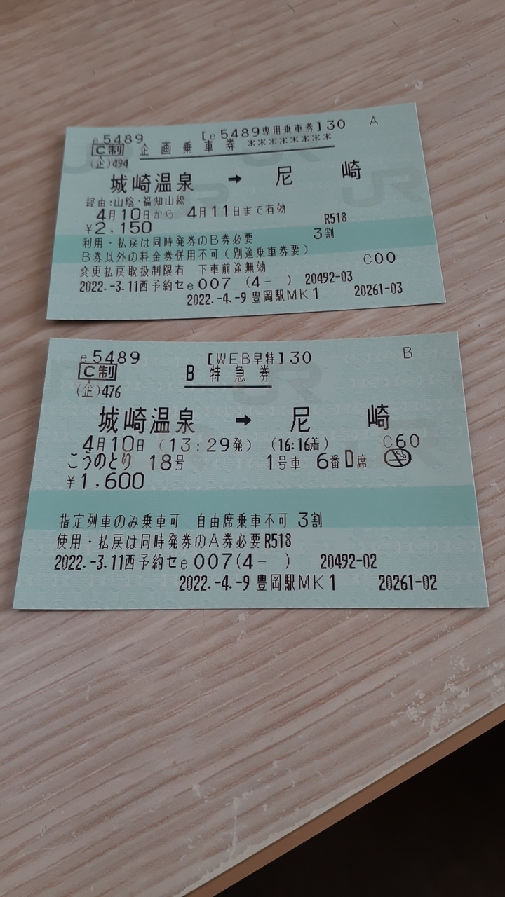 但しJ-WESTカード会員の方の場合、チケットレス専用の割引特急料金の商品があり、こちらの場合、大阪~福知山間の特急料金が1,400円程度、尼崎~城崎温泉間で1,750円程度であるのに対し、WEB早特21での特急料金は大阪~福知山間で1,360円、尼崎~城崎温泉間で1,600円である為、J-WESTカード会員の場合、主に乗車券部分が割引になると思ったほうが良いかもしれません。