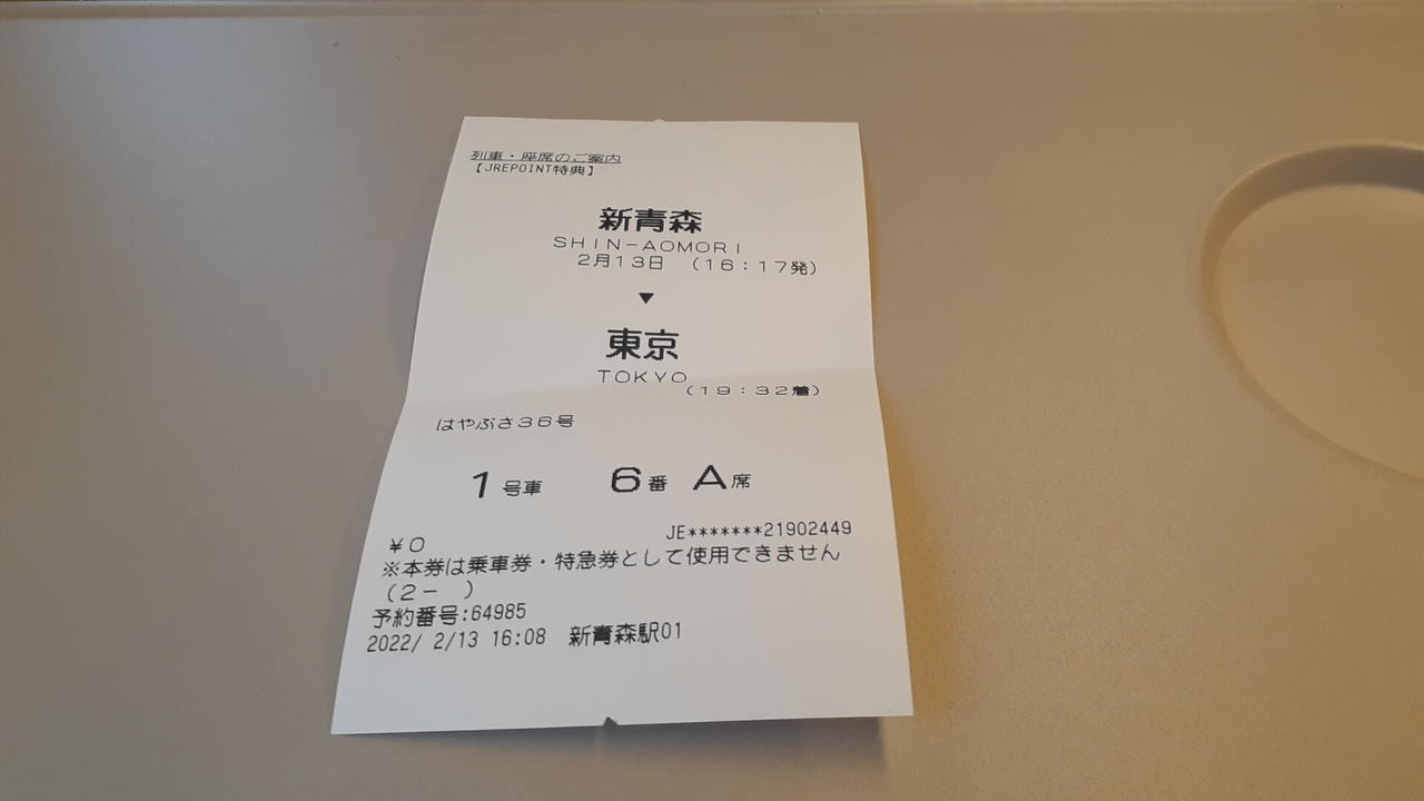 しかし2022年2月13日に新青森から東京までこの「JRE POINT特典チケット」を利用したところ、2月中に利用する場合、通常必要となる12,110ポイントのさらに半分以下となる6,000ポイントの利用で新幹線に乗れるらしく、僅か6,000ポイントではやぶさ号に乗ることができ、大変お得でした。