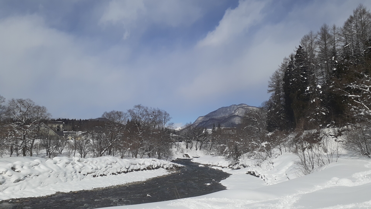 ただ当日は曇りの予報でしたが、訪れた時は一部箇所で青空を目にすることができ、川の景色と山々の景色、雪の三奏からなる絶景を楽しめたのは良かったです。