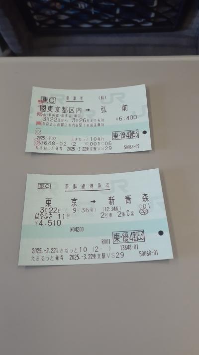 2025年3月22日に東北新幹線のはやぶさと奥羽本線の普通列車を乗り継ぐかたちで東京~弘前間の乗車券と東京~新青森間のはやぶさ号の指定席特急券を購入し、利用しました。