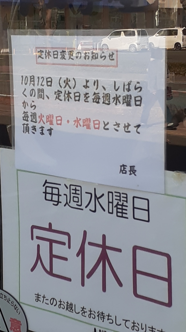 2021年10月12日より水曜日に加えて火曜日も定休日になりました