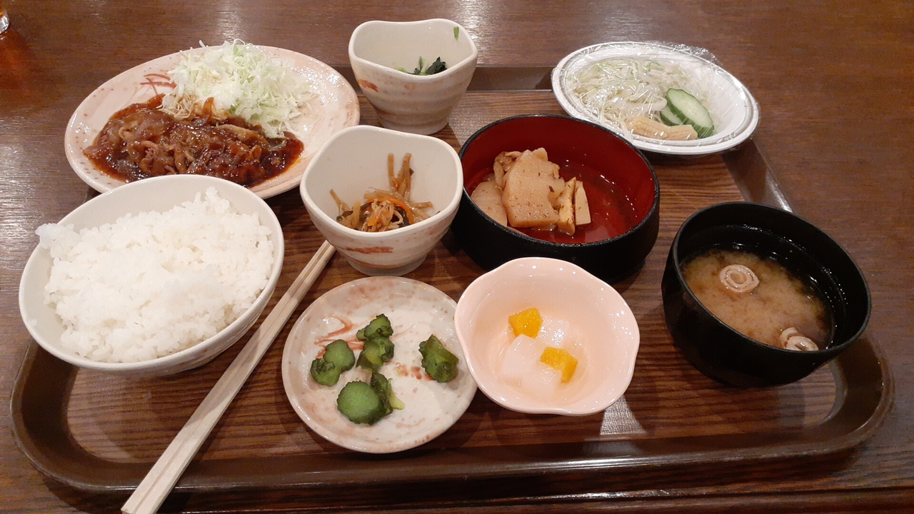 中身はご飯・味噌汁の他、しょうが焼き・筍の煮物・キャベツの千切り・お浸し・きんぴらごぼう等が提供され、種類は充実していましたが、この日の接客スタッフの応接態度が非常に悪く、入店・退店時の挨拶がないだけでなく、食券を預かったり料理を渡す時も無言で渡されました。