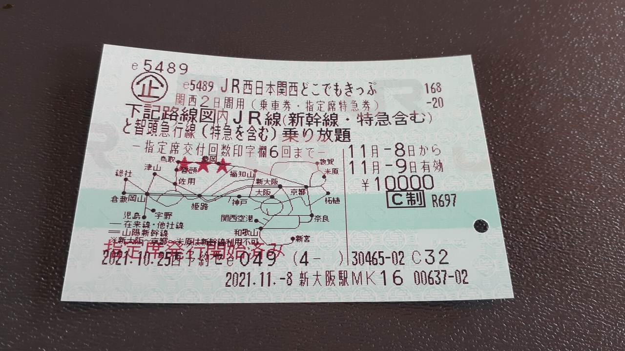 この切符、関西近郊の一定エリアのJR西日本及び智頭急行の新幹線・特急・快速・普通列車の自由席が2021年12月26日までの好みの連続した2日間10,000円で利用し放題という内容です。また追加料金不要で6回まで普通車指定席が利用可能です。