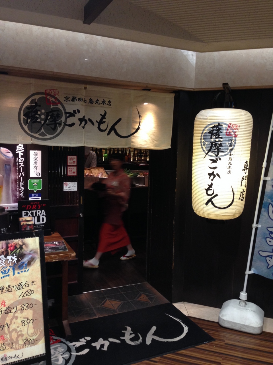 場所は地下鉄の四条駅あるいは阪急の烏丸駅からすぐです。地下一階ですので地上に上がらずに行けます。お魚が中心のようですが鳥もあります。文字通り鹿児島の名産を取り揃えております。コースを頼むと飲み放題が500円つくそうです。
