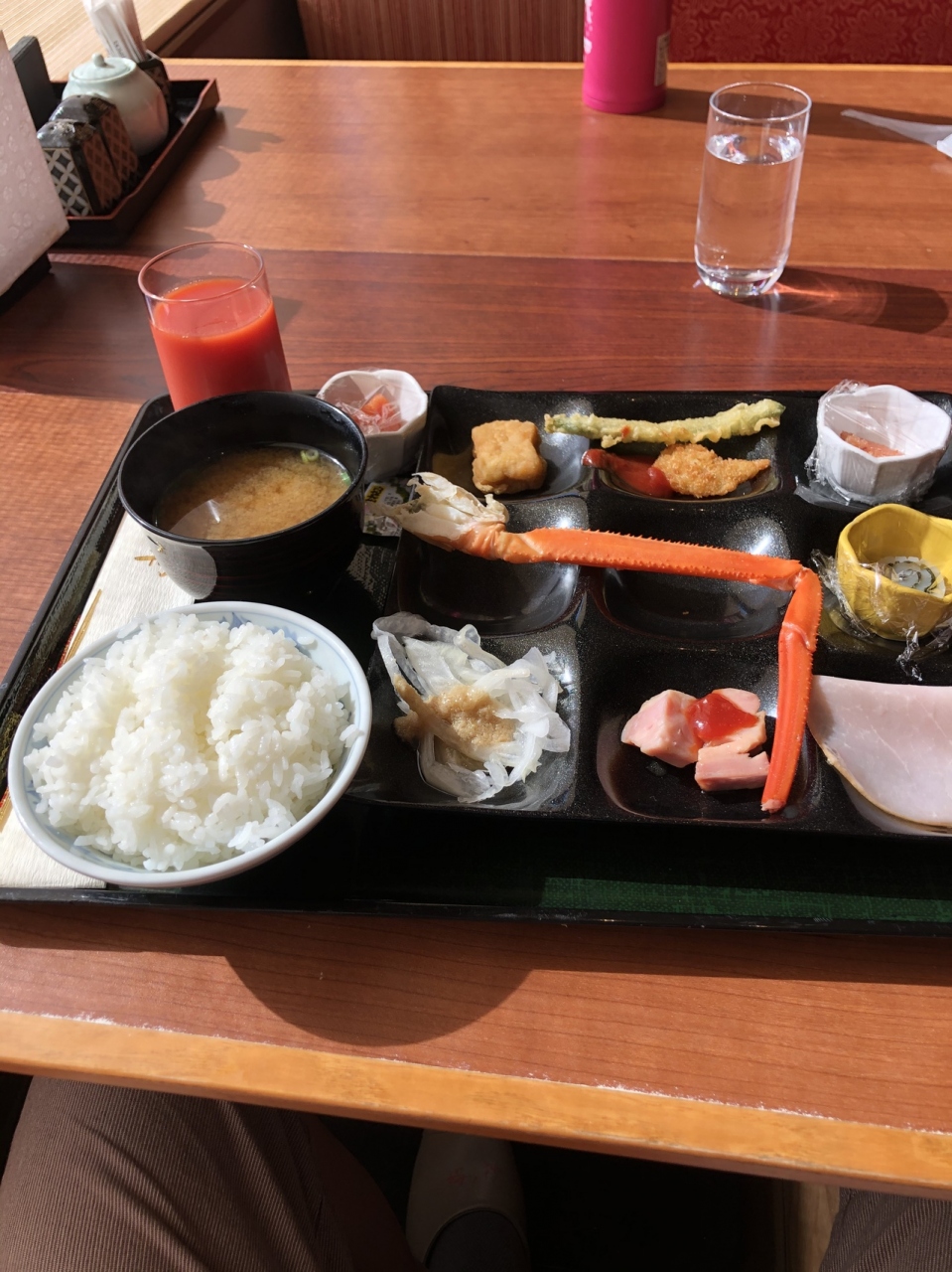 グランドホテル内にあるこのレストランは、朝食ビュッフェ等によく使われます。このコロナの状況の中でお店側の努力が非常に素晴らしいと感じました。一つ一つにラップが巻いてあって他の人の飛沫などが飛ばないように細心の注意を払われています。食事のほうも朝のビュッフェですがカニなども揃えられていて地元の特産物がふんだんに使われています。