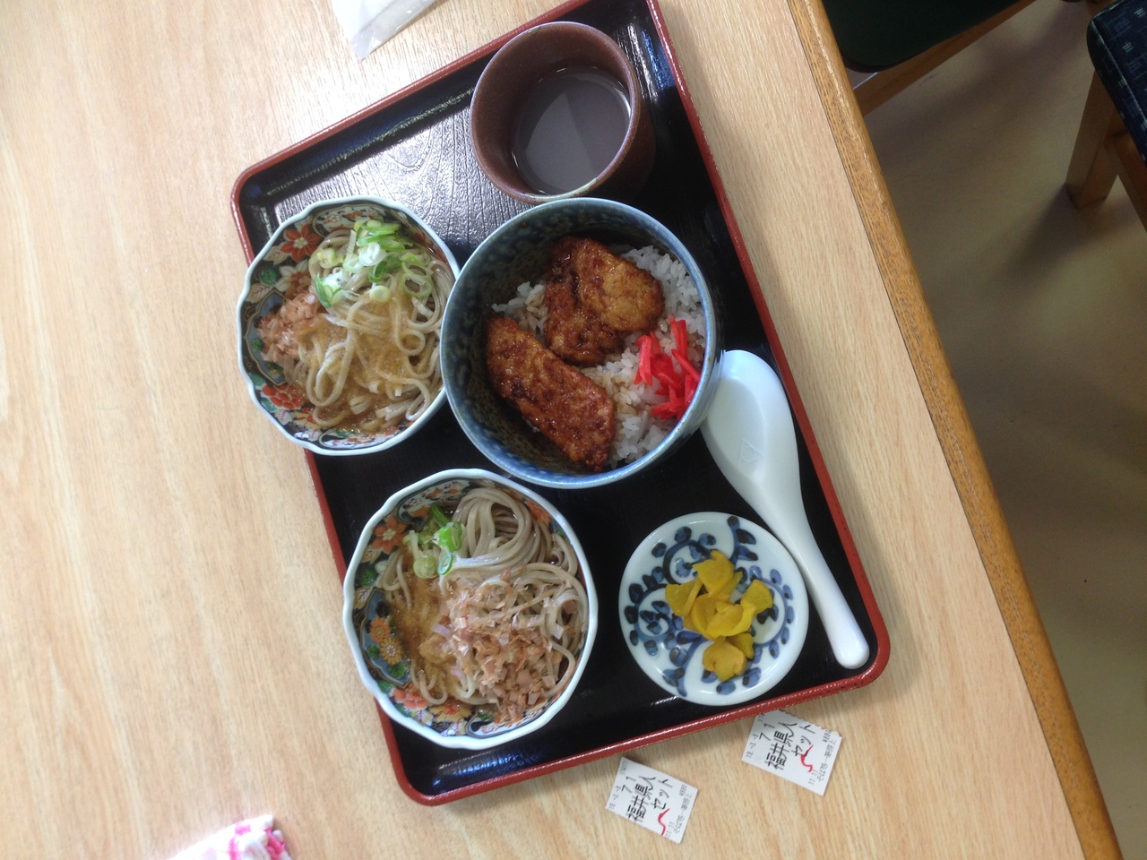 丸岡城の麓にある唯一の食堂です。本多成重?公の有名な一筆啓上に因んだ蕎麦屋さんです。こちらの看板メニューはお蕎麦とソースかつ丼がセットになっている福井県人セットです。お蕎麦は小盛りですが二つ付いているのでお腹いっぱいになります。お蕎麦も冷たくコシがあります。