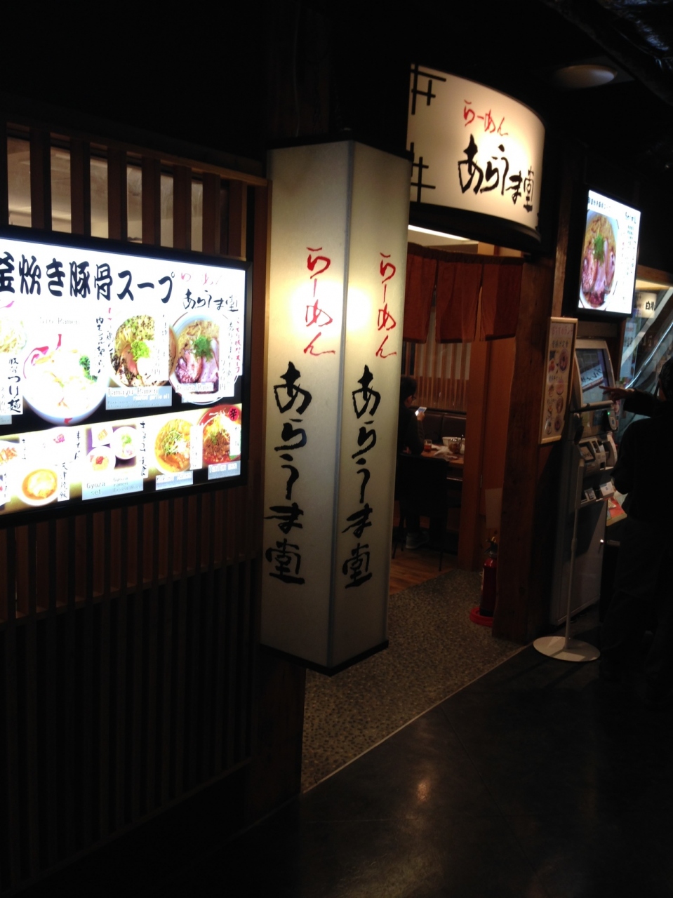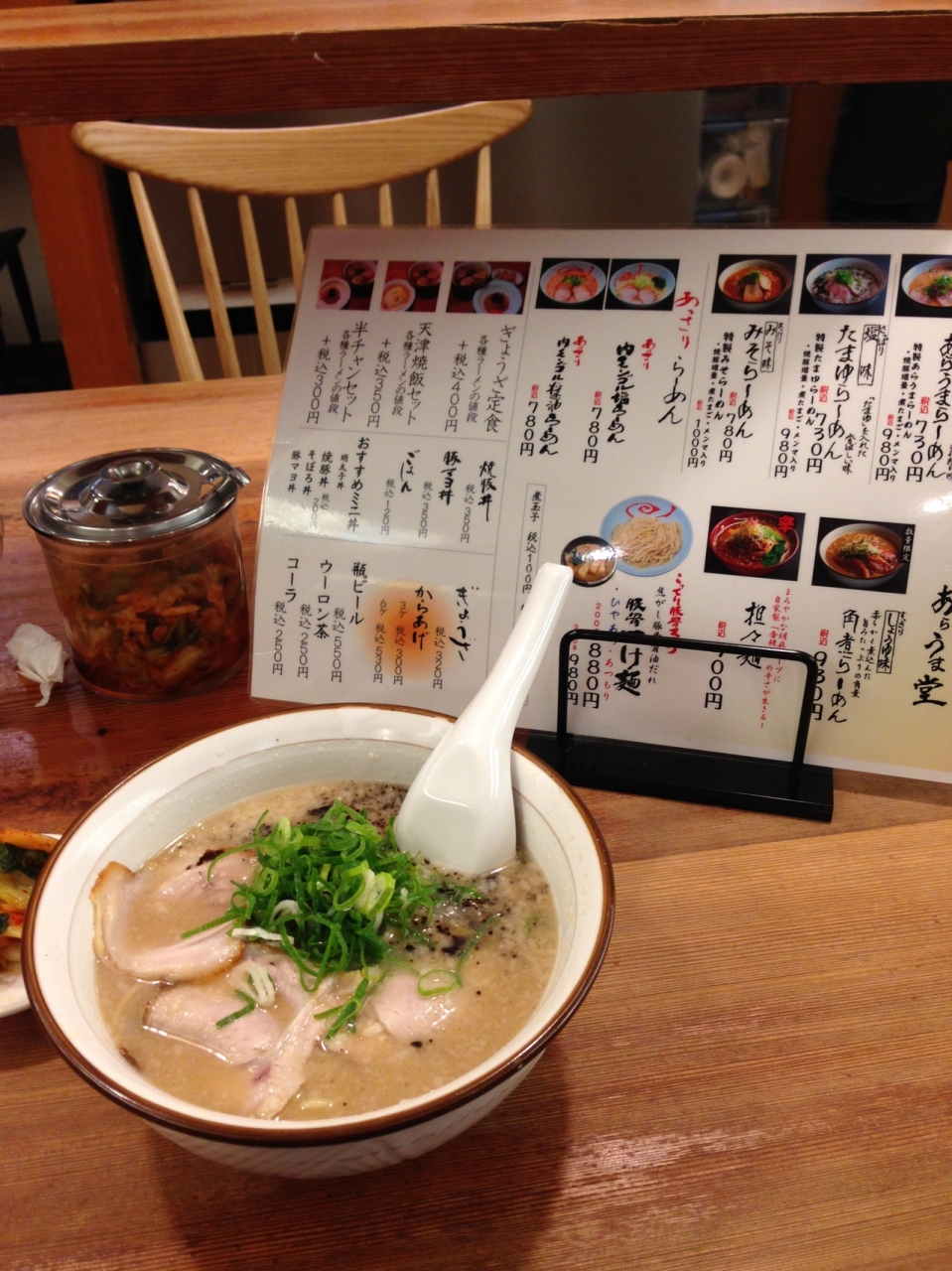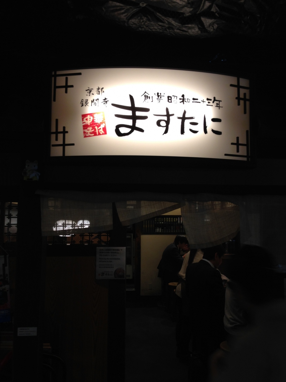 京都では最も有名なラーメン店のひとつです。本店はもうちょっと北部にあるのですが、京都駅からすぐのジェイアール伊勢丹の10階にある拉麺小路内にもあります。味は変わらず、背脂入りの醤油ラーメンです。いつも行列が出来ます。