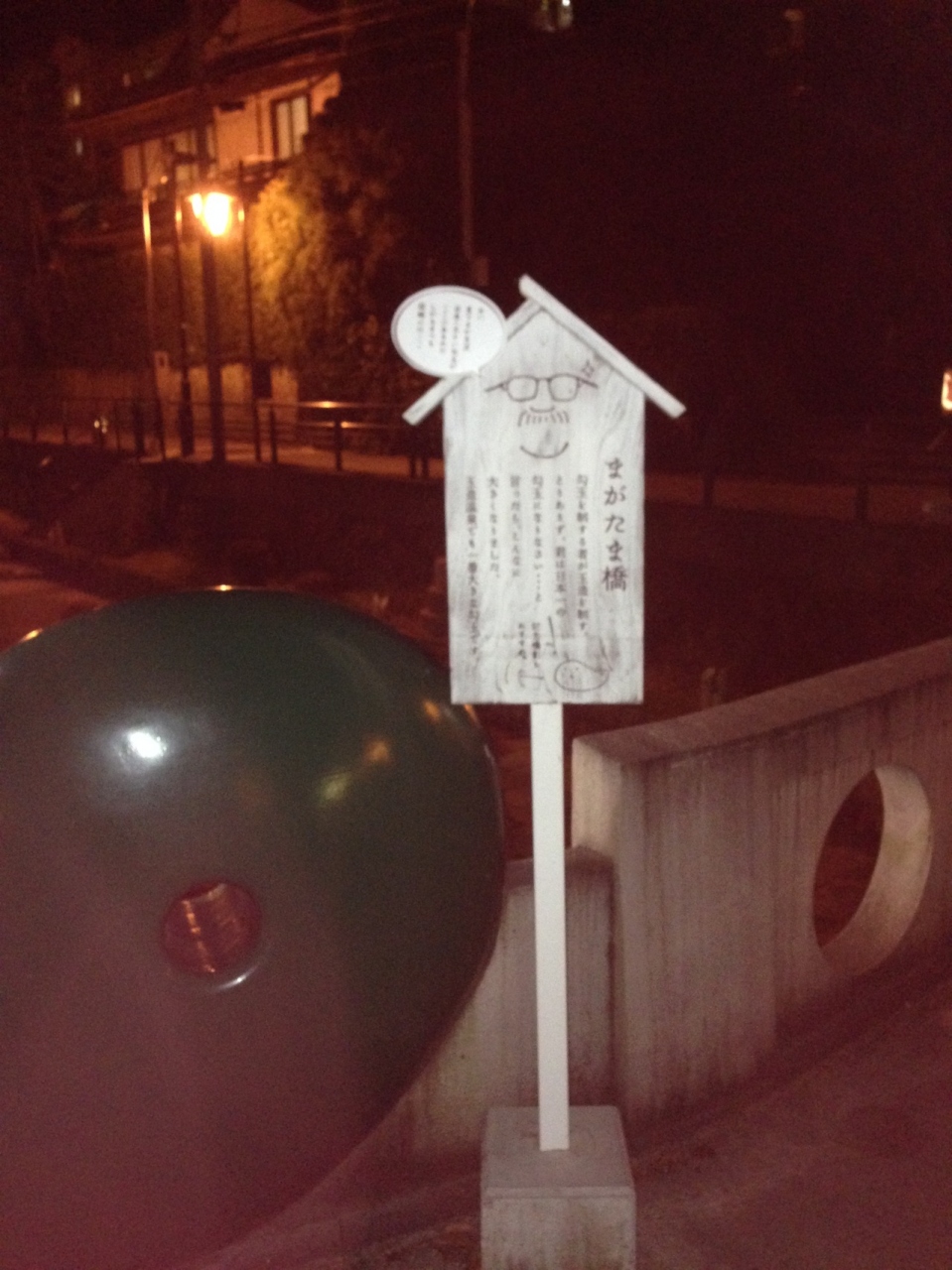 玉造温泉駅を出て一番奥手にあります。玉造温泉のトレードマークの勾玉の大型レプリカが橋の両脇にあります。