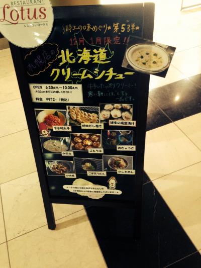 博多三日目で、こちらのホテルを利用しました。ロビーは白基調でクリスマスツリーがあります。お部屋もシモンズベッドで、外では寝られない私も熟睡します。風呂は温泉ではないですが大浴場がありアメニティが豊富でした。こちらのウリは何と言ってもご当地メシをふんだんに取り入れたビュッフェです。定番ご当地メシの他に季節により特別メニューがあるようです。今回は北海道のクリームシチューでした。