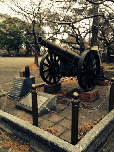 ここは小倉城天守と八坂神社と周囲の遊歩道をひっくるめて庭園だと思います。市役所の方々始め近くのサラリーマンの人達が昼の休憩に集う光景を目にします。春になるとお堀周辺は桜で溢れ帰ります。天守台には大砲と弾丸も飾られています。