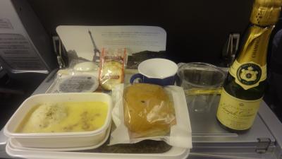パリ到着前の食事です。プレエコなんでシャンパン飲めます♪朝からシャンパ...