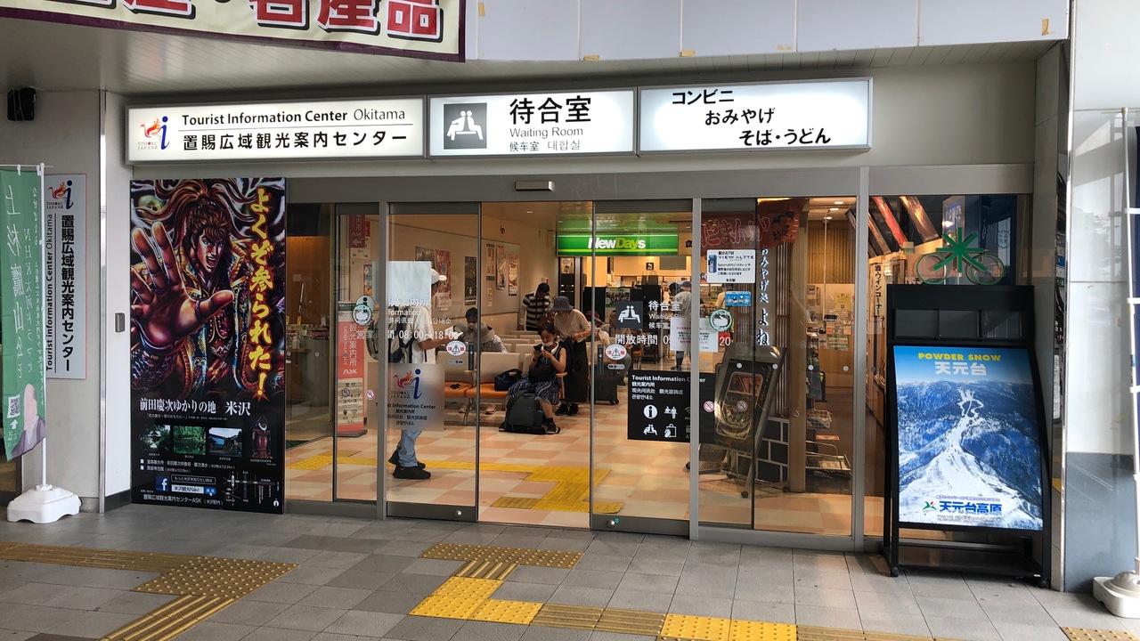 米沢駅1階にある観光案内所です。有人カウンター、観光パンフレットコーナーがあります。置賜とは、山形県南部(米沢市・長井市など)を指す名前です。観光案内所の近くに、コンビニ、うどんコーナーなどもあります。