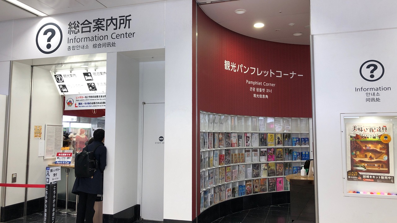 JR博多駅にある観光案内所です。有人カウンターと、無料観光パンフレットコーナーがあります。福岡市観光案内所は、天神にも大きな施設がありますが、博多駅の案内所は小さめです。駅レンタカーの受付もこちらです。
