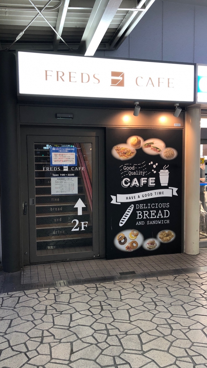 十三駅2F、乗り換え通路にあるベーカリー・カフェです。阪急沿線にあるフレッズカフェの中では、広めの店舗です。コンセント付きのカウンター席、ソファ席などがあります。毎日1杯コーヒーがいただけるサブスクも始まりました。