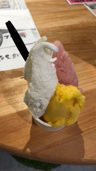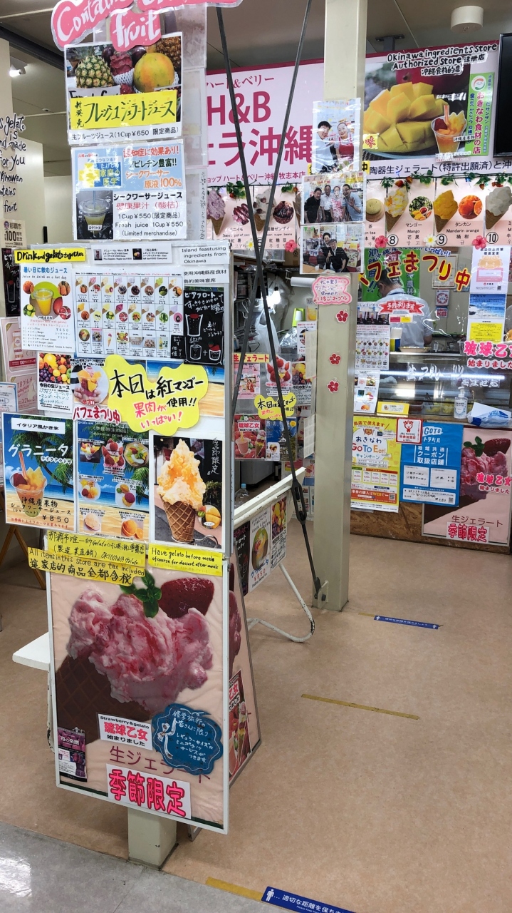沖縄県内に何店舗かあるジェラートショップです。イーアス豊崎店は、1Fのフードコートにあります。共用のイートインスペースが広いので、座って食べることができます。ミルク・スイカ・マンゴーを食べました。沖縄の県産品が使われており、沖縄でしか味わえない味です。イーアス&アシビナーでもらえるクーポンで、ダブルからトリプルに変更することができました。