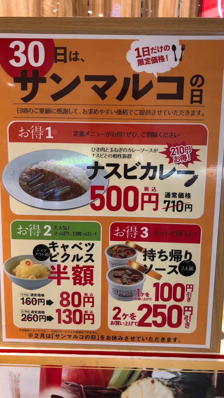 全国のデパ地下などにあるカレー屋さんです。毎月30日は、サンマルコの日と呼ばれ、いくつかのお得があります。店内飲食の場合、ナスビカレー710円が500円となります。持ち帰りの場合、カレーソース1個が100円引き、2個買うと250円引きとなります。