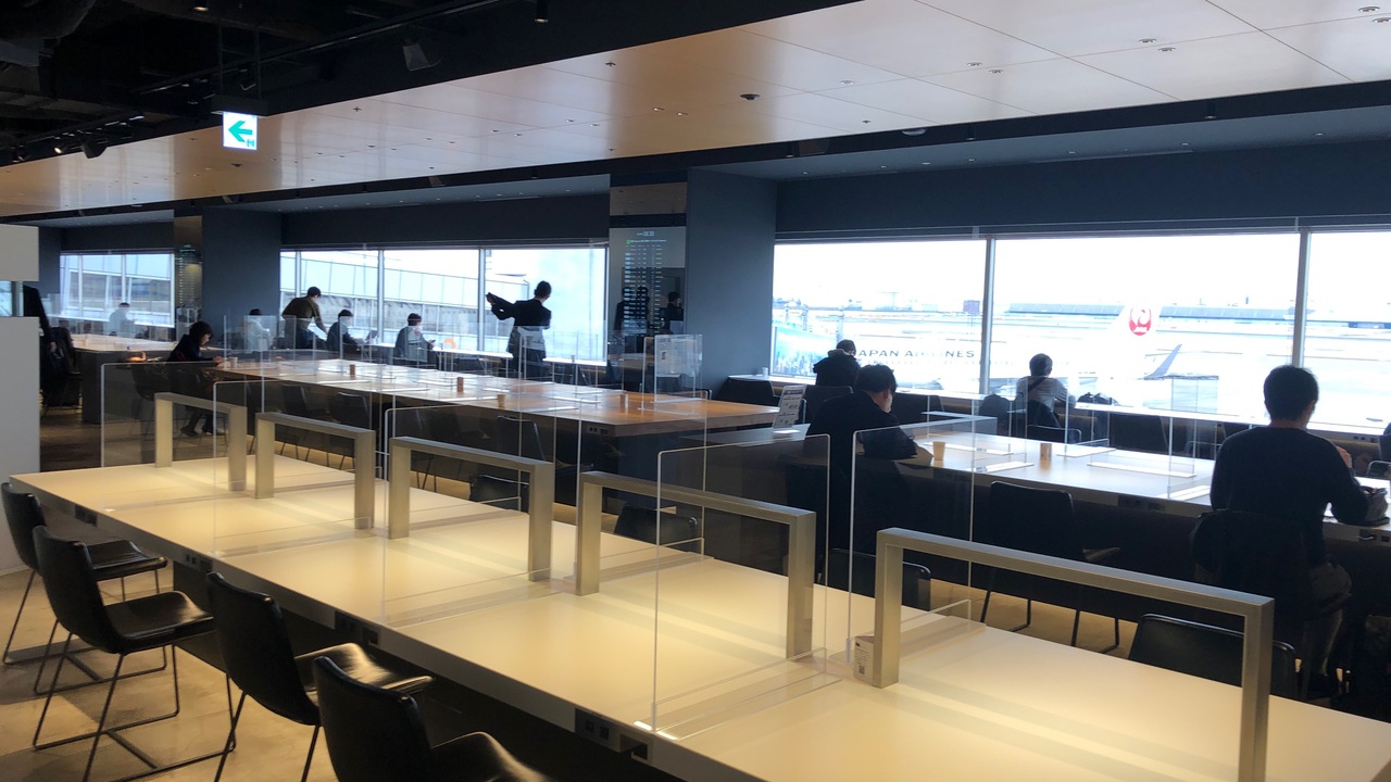 羽田空港にいくつかある、クレジットカードラウンジです。保安検査後、搭乗エリアにあります。広いので、だいたい触れます。スタイリッシュなカフェのような雰囲気です。机が大きいので、パソコンなどの作業にも適しています。
