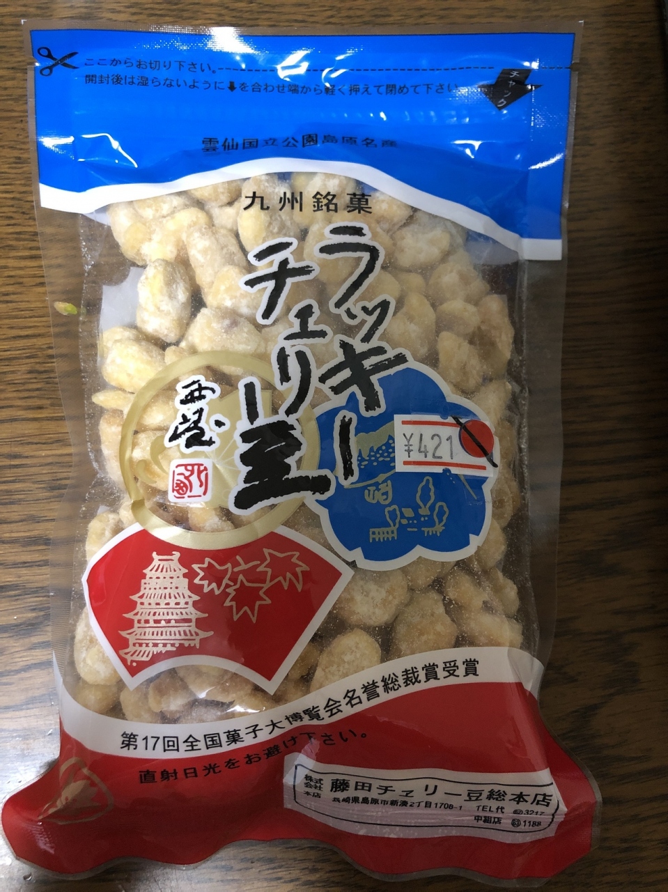 島原は、かんざらしが有名ですが、チェリー豆というお菓子もあります。昔ながらの、駄菓子のような物です。揚げた空豆に、砂糖や生姜をまぶしてあります。生姜味風味なので、好き嫌いは分かれそうです。個人的には、油で揚げてある香ばしさが好きです。