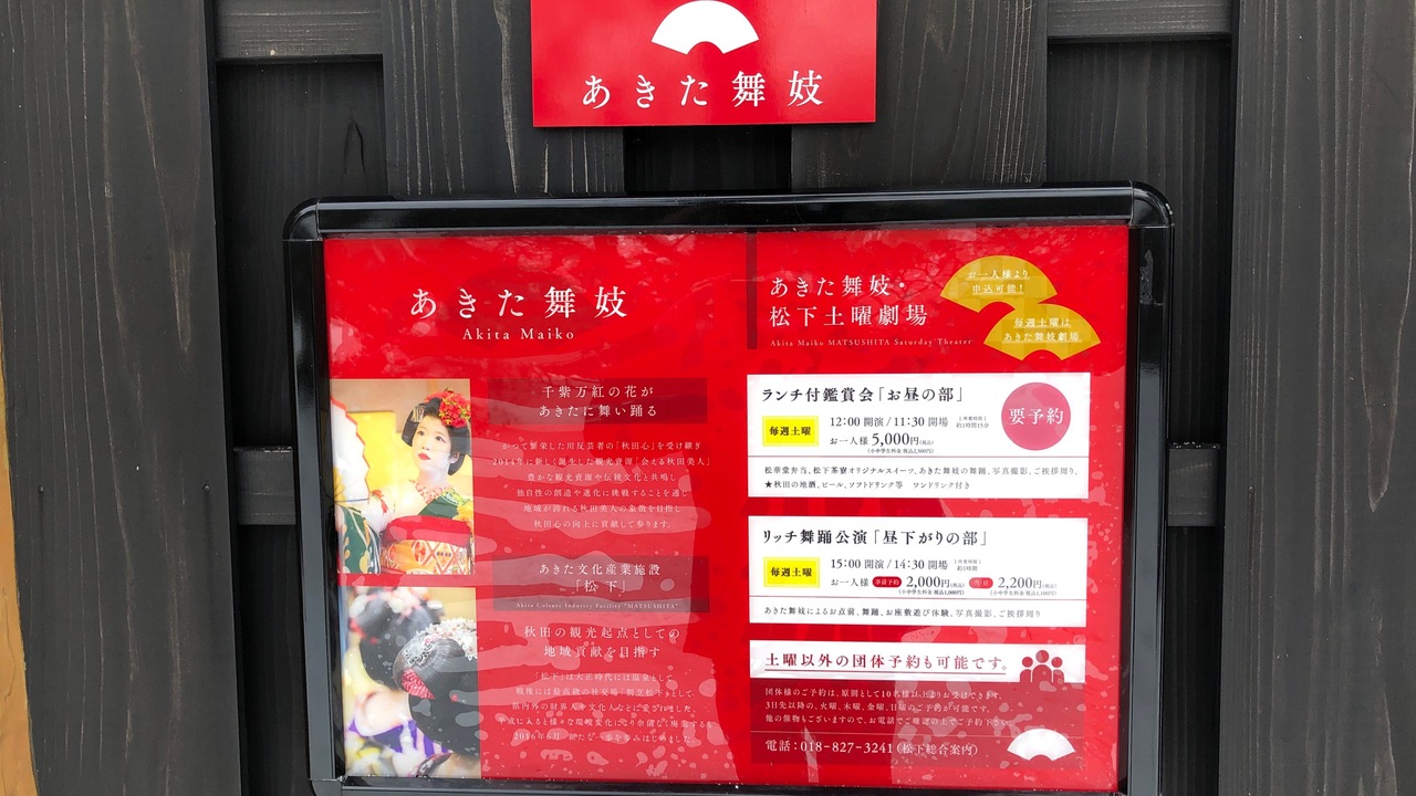 千秋公園の中にある和風の建物です。毎週土曜日、あきた舞妓の芸を鑑賞することができます。あきた舞妓は、川反芸者の流れを受け継ぐ、秋田の新たな芸能です。鑑賞だけなら2000円と、京都の舞妓芸能より格段にお手頃です。