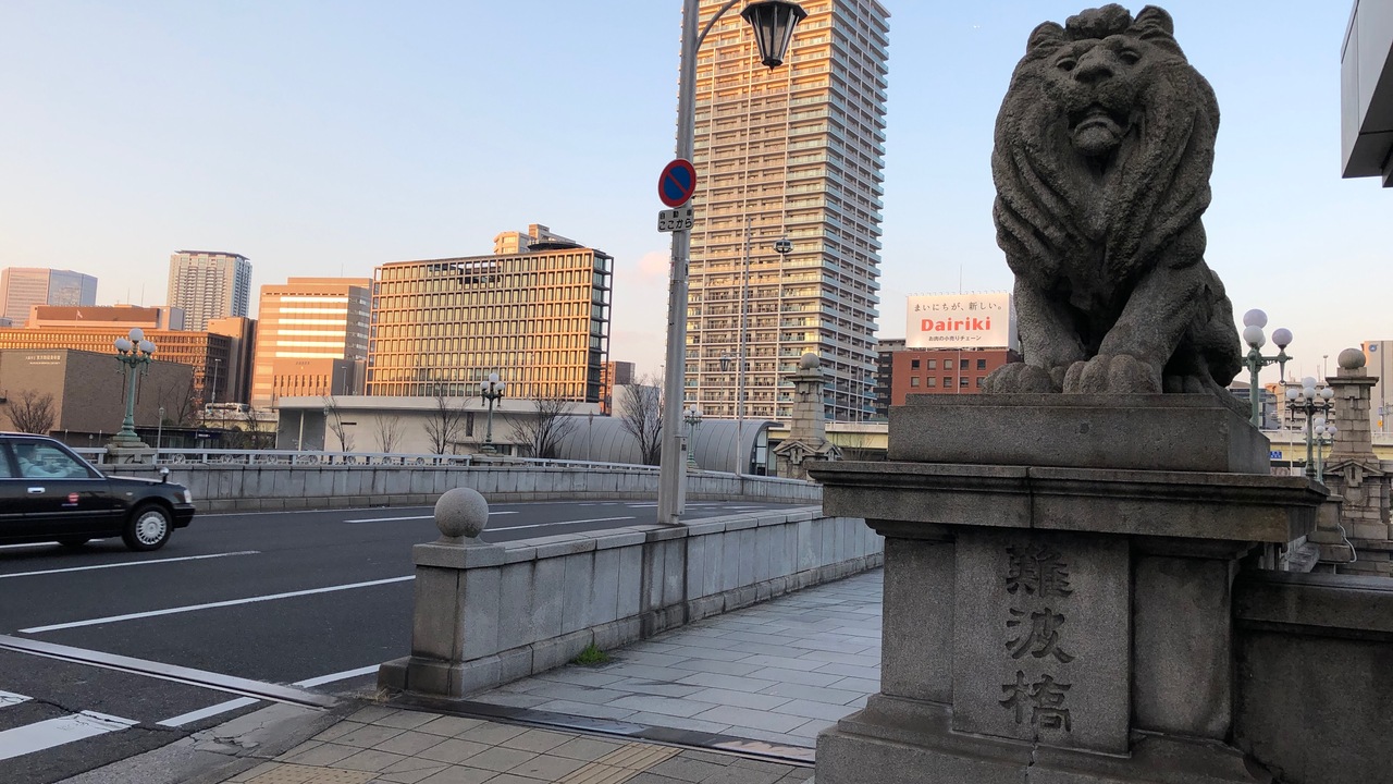 大阪市中心部・堺筋の橋です。全長190mで、中之島公園などをまたいでいます。橋の前後左右・計4か所に、ライオンの石像があることから、ライオン橋とも呼ばれます。4つのライオンは、神社の狛犬のように、阿吽の口の形をしています。