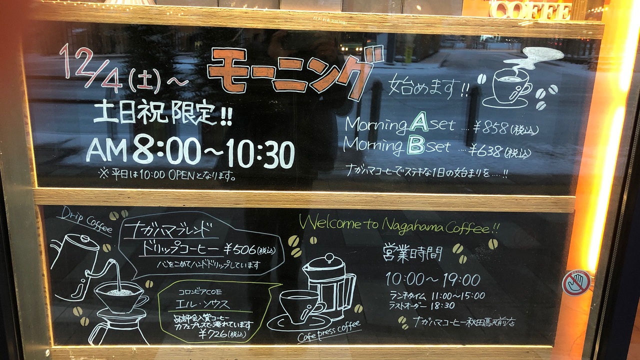 秋田駅西口・オーパ1Fにあるカフェです。2021年12月より、土日のオープンが10時から8時に早まり、土日限定でモーニングメニューが始まりました。今回は、19時の閉店間際に、コーヒーとケーキをいただきました。安くはないケーキでしたが、スイーツ店なみの美味しさに、満足しました。