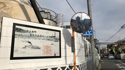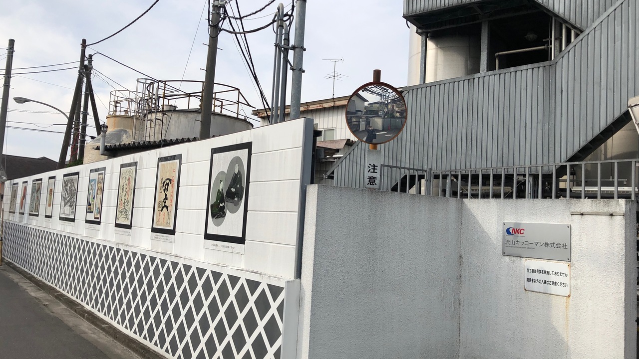 流山のキッコーマン工場の壁沿いに、みりんの歴史などに関する展示が並びます。普通の車道に沿っているので、誰でも訪問可能です。同じエリアの流山本町には、たくさんの行灯も展示されているので、散策におすすめです。