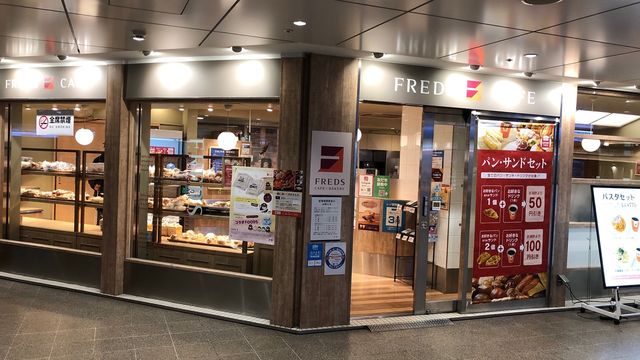 阪急梅田駅・2F改札口を出た場所にあります。阪急が運営するベーカリー・カフェです。イートインの場合、ドリンクとセットでパン1個につき50円引きとなります。閉店前に、パンの値引きが行われることもあります。