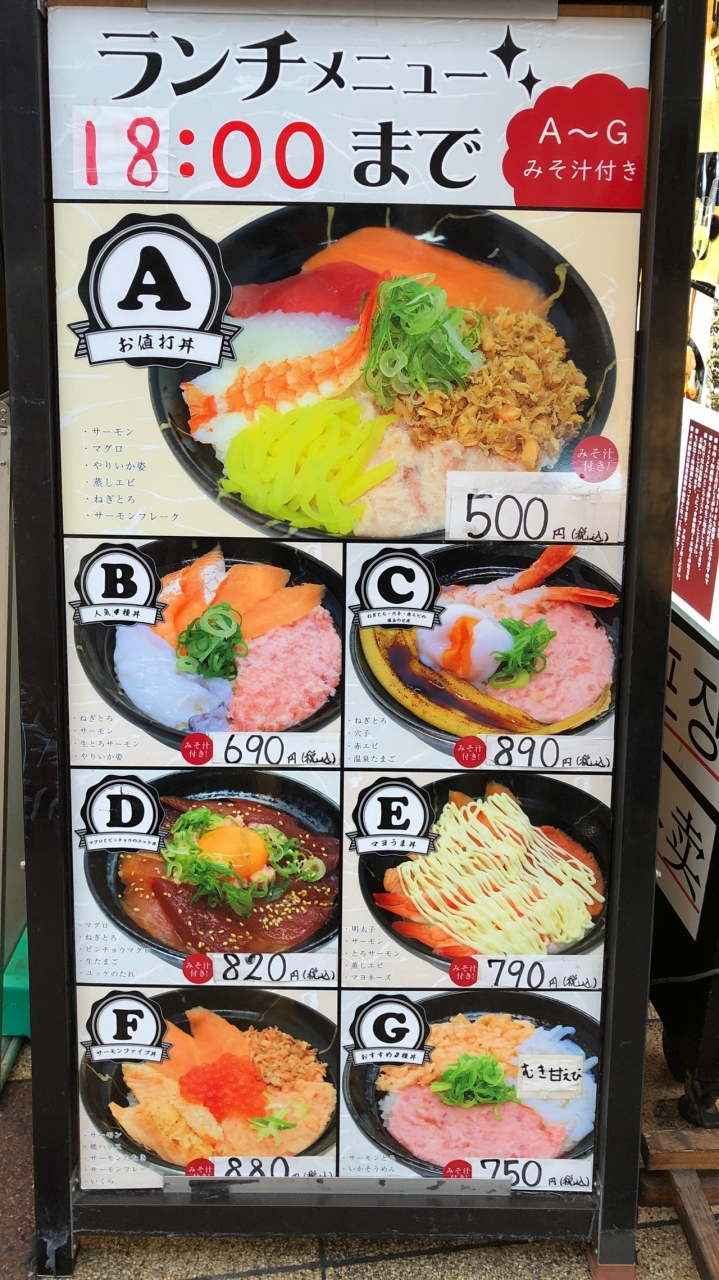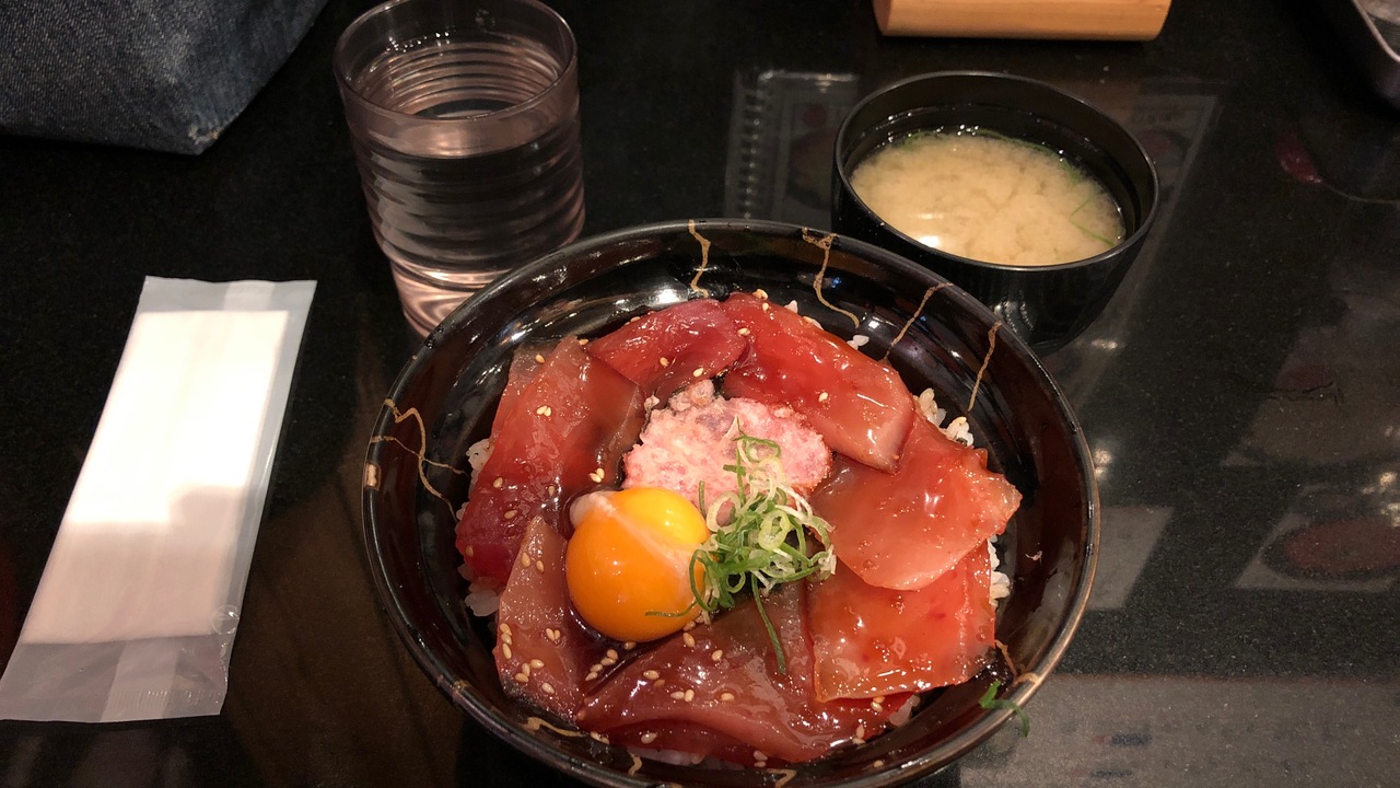 南海難波通りアーケードにある海鮮丼屋さんです。牛丼屋のようなカウンター席が並んでいます。18時まで、お得なランチメニューが注文できます。820円の、2種のまぐろ&ねぎとろのユッケ丼を食べました。ネタの量がまあまあ多かったので満足です。