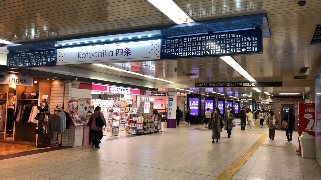 そんなに大きな商業施設ではありません。漢字で書くと「古今烏丸」です。B1Fで、地下鉄四条駅・阪急烏丸駅につながっています。地下には何店舗かの飲食店、2Fにインテリアショップ・アクタス、3Fに映画館などがあります。