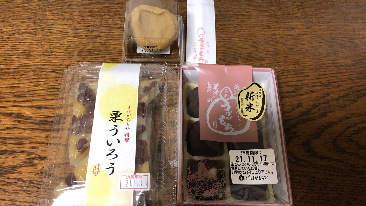 草津銘菓・うばがもちの工場に隣接した店舗です。2021年、閉店となりました。草津駅周辺に3店舗あるので、今後は、そちらの店で購入することができます。秋には、栗ういろう・栗きんとんなど、秋らしい限定菓子も売られていました。