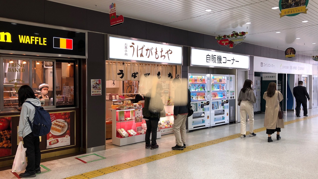 うばがもちは、餅米の団子をこし餡で包んだ、草津名物の和菓子です。コンコース店は、草津駅の改札を出ですぐの場所にあり、鉄道利用者に便利です。小さな店舗なので、品揃えは少ないです。草津駅前の商業施設・エルティ932の2Fにある店舗の方が、品揃えは多いです。
